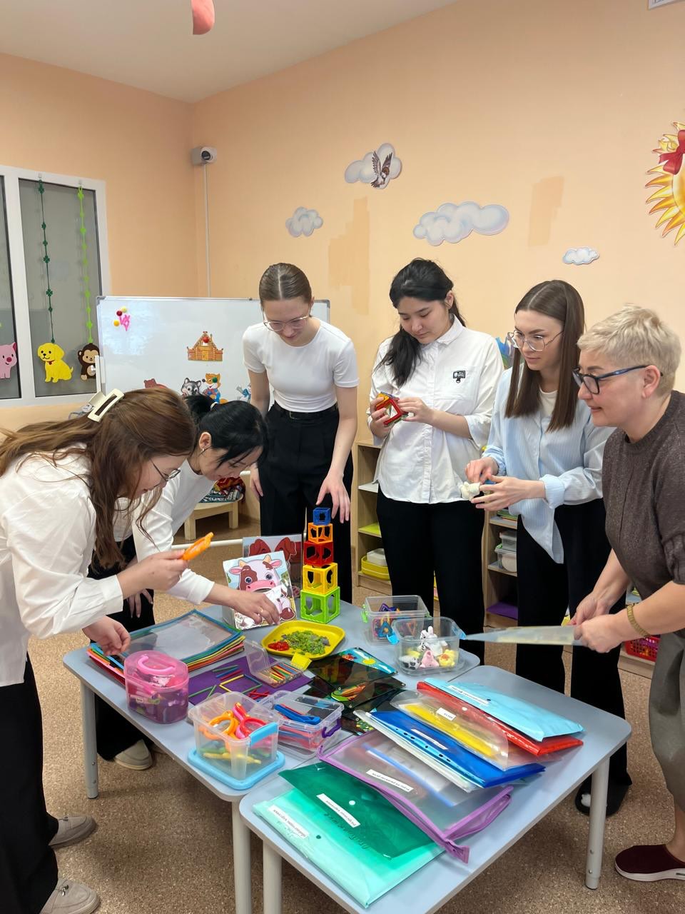 Практика барысында студенттер балалармен жұмыс жасауда қолданылатын көрнекі құралдар мен дидактикалық ойындардың, сенсорлық және үстел-баспа материалдарының түрлерімен танысты 🧩🎨