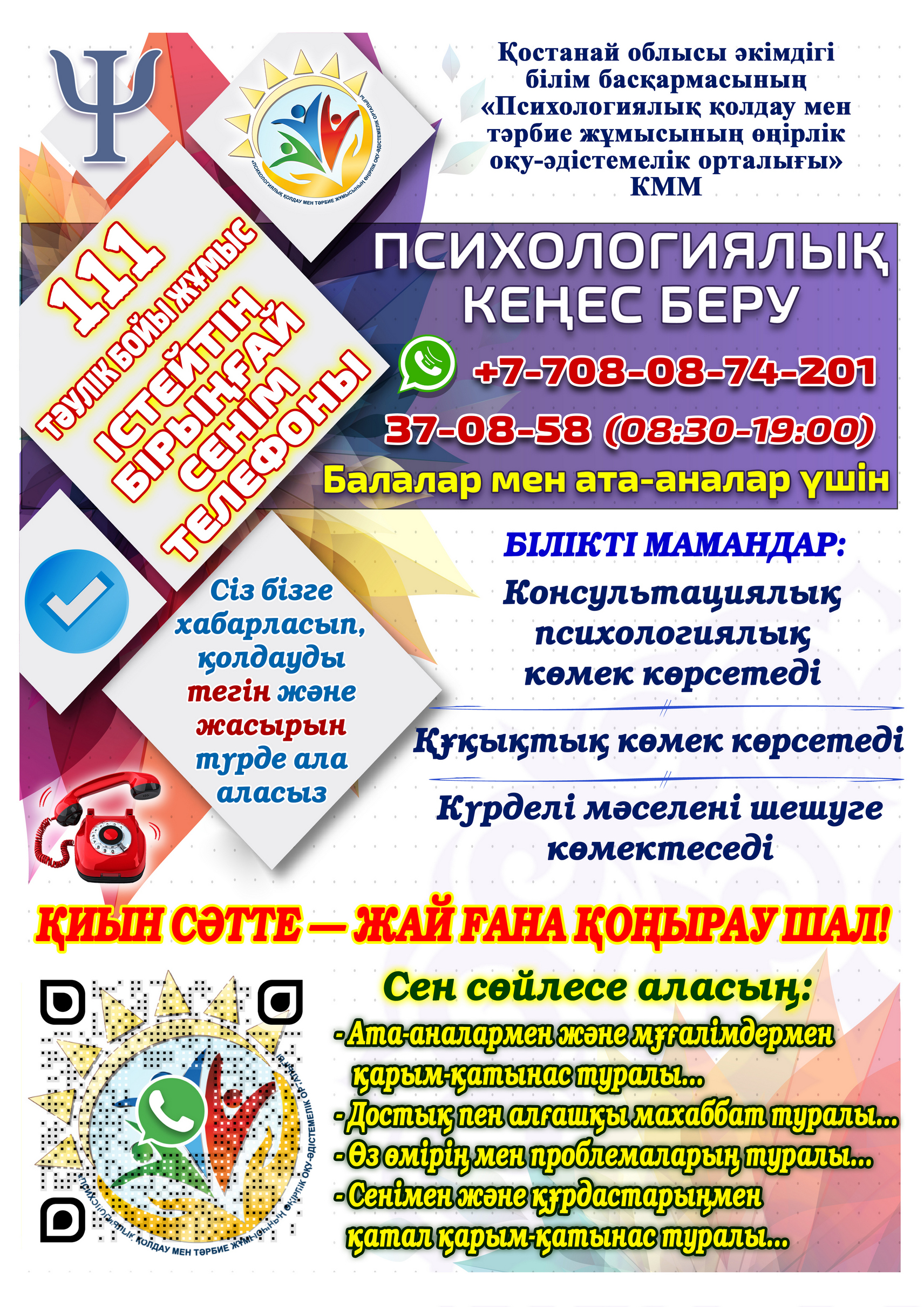 22-65-32 психологиялық көмек көрсету дағдарыс орталығы.