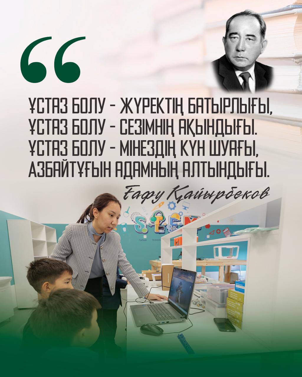 Глава государства Касым-Жомарт Токаев отметил: «Нет звания выше педагога. Даже самые великие личности остались в истории как ученики своих наставников. Судьба нации – в их руках. Мы должны чтить педагогов, которые играют важную роль в нашем обществе».